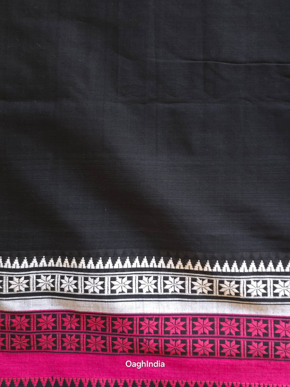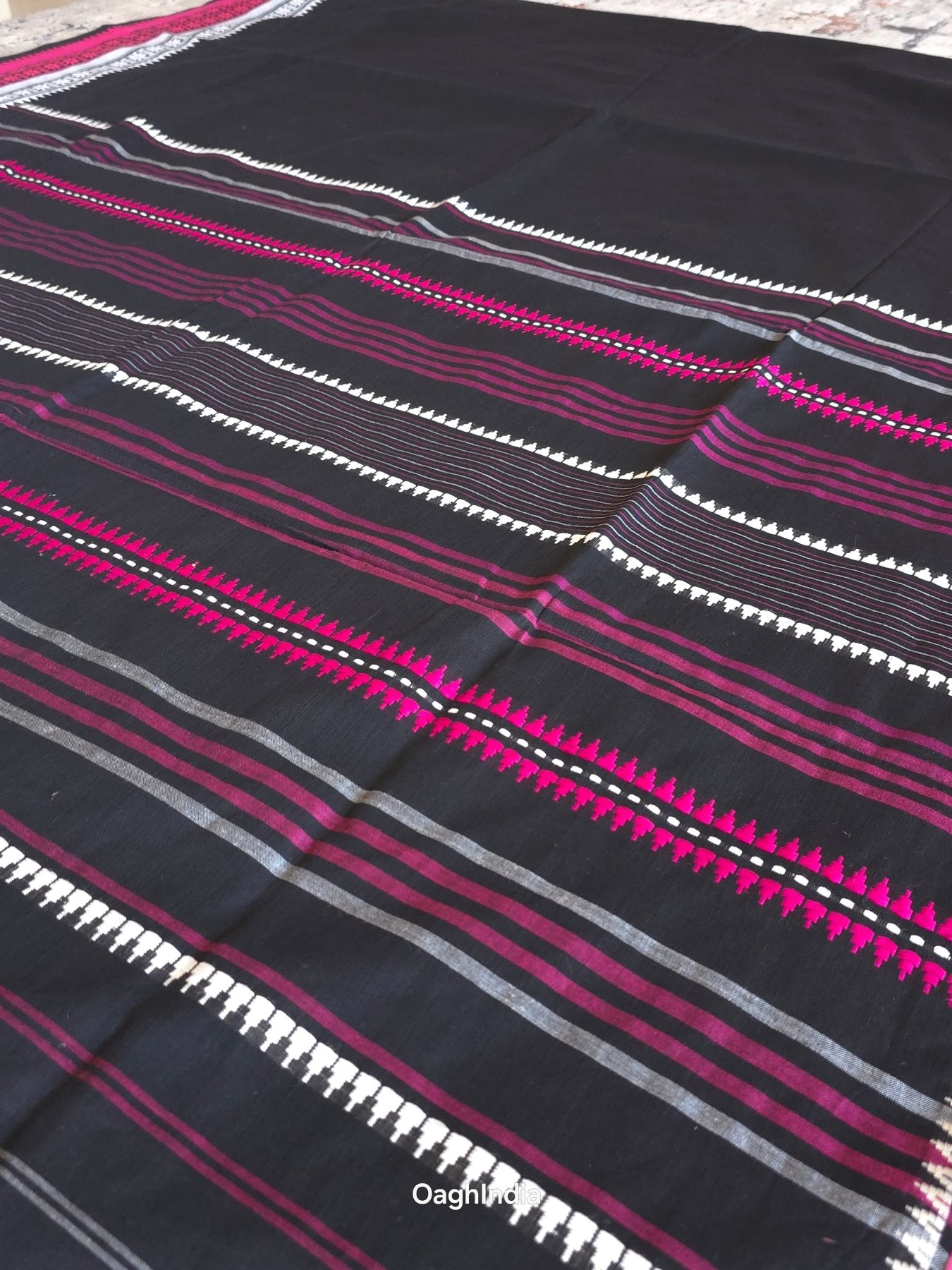 This Dhonekhali cotton handloom saree is a striking blend of tradition and elegance. The rich black base is beautifully contrasted with intricate white temple borders, adding a touch of heritage charm. The saree features horizontal stripes in vibrant pink and white, lending a bold yet graceful appeal. The pallu is adorned with traditional motifs in a contrasting magenta, making it a perfect choice for both cultural gatherings and contemporary styling. Crafted in pure cotton, this saree is breathable, lightweight, and ideal for all-day comfort. A timeless piece that reflects Bengal's rich weaving tradition.