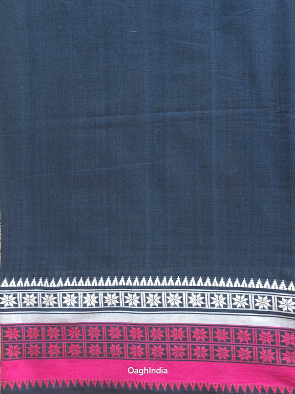 This Dhonekhali cotton handloom saree is a striking blend of tradition and elegance. The rich black base is beautifully contrasted with intricate white temple borders, adding a touch of heritage charm. The saree features horizontal stripes in vibrant pink and white, lending a bold yet graceful appeal. The pallu is adorned with traditional motifs in a contrasting magenta, making it a perfect choice for both cultural gatherings and contemporary styling. Crafted in pure cotton, this saree is breathable, lightweight, and ideal for all-day comfort. A timeless piece that reflects Bengal's rich weaving tradition.