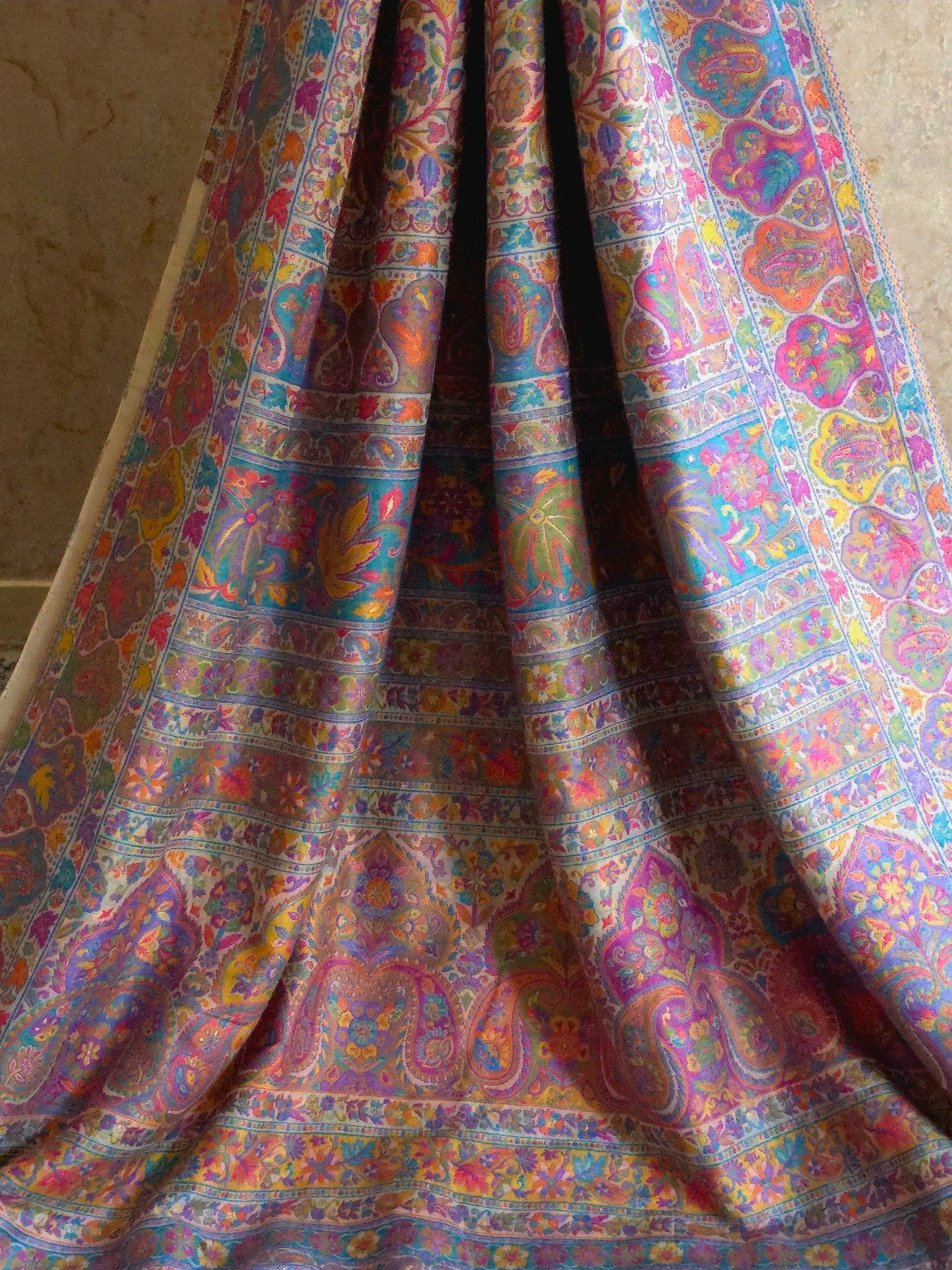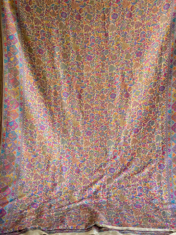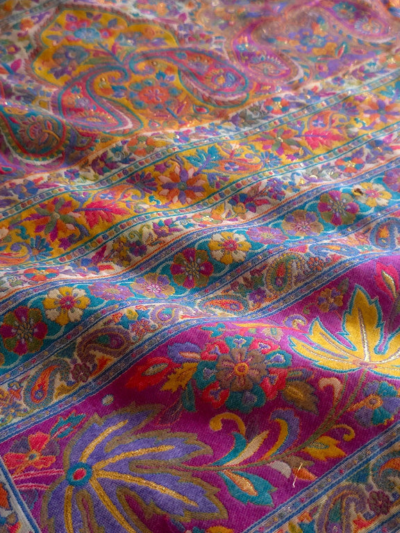 Kashmiri silk blend with Kashmiri Cotton within the traditiona weave, known for its luxurious feel and dense, brocade-like design.