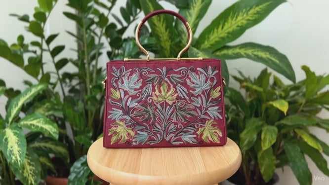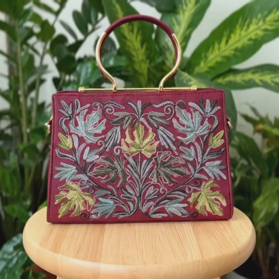 Rich, artistic, and beautifully detailed — the Kashmiri Tote Bag in Maroon adds a touch of heritage sophistication to your everyday style. Crafted on plush velvet, this compact tote features intricate Kashmiri floral embroidery in shades of earthy green, and leafy green, creating a striking contrast against the dark maroon base.