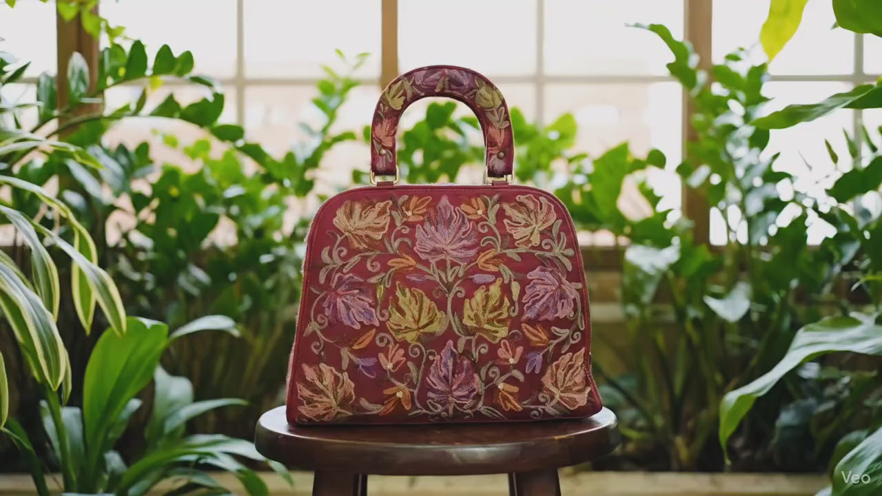 Rich, artistic, and beautifully detailed — the Kashmiri Tote Bag in Maroon adds a touch of heritage sophistication to your everyday style. Crafted on plush velvet, this compact tote features intricate Kashmiri floral embroidery in shades of mustard, olive, purple, and light pink, creating a striking contrast against the dark maroon base.