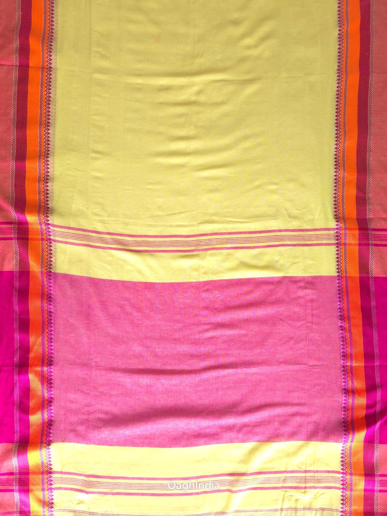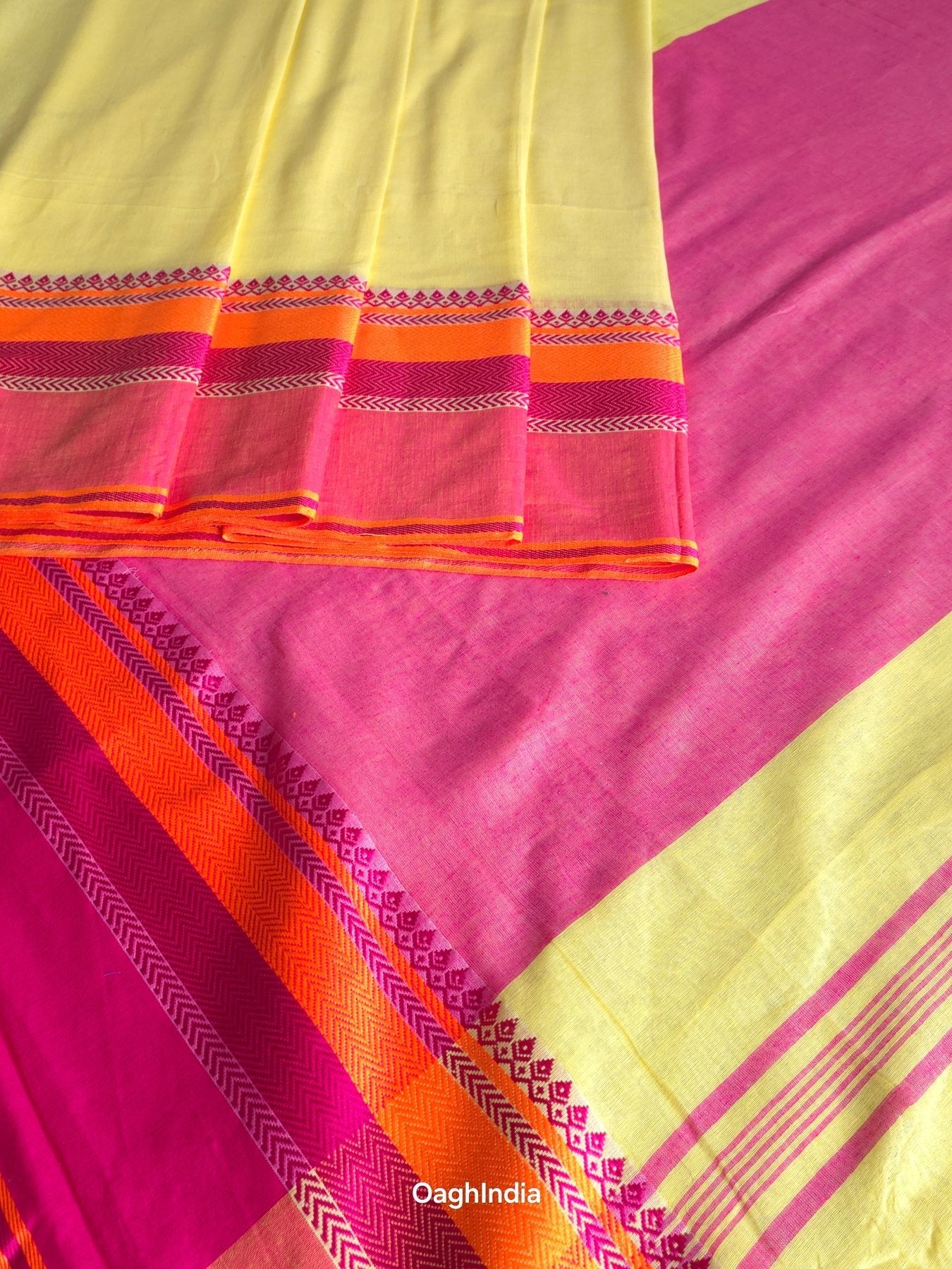 Crafted from pure cotton, these sarees are as comfortable as they are beautiful! With a soft, easy drape, you'll feel at ease all day long. The plain body gives a minimalistic charm, while the intricately woven borders and contrasting hues on the body and pallu add an eye-catching pop of elegance.