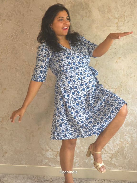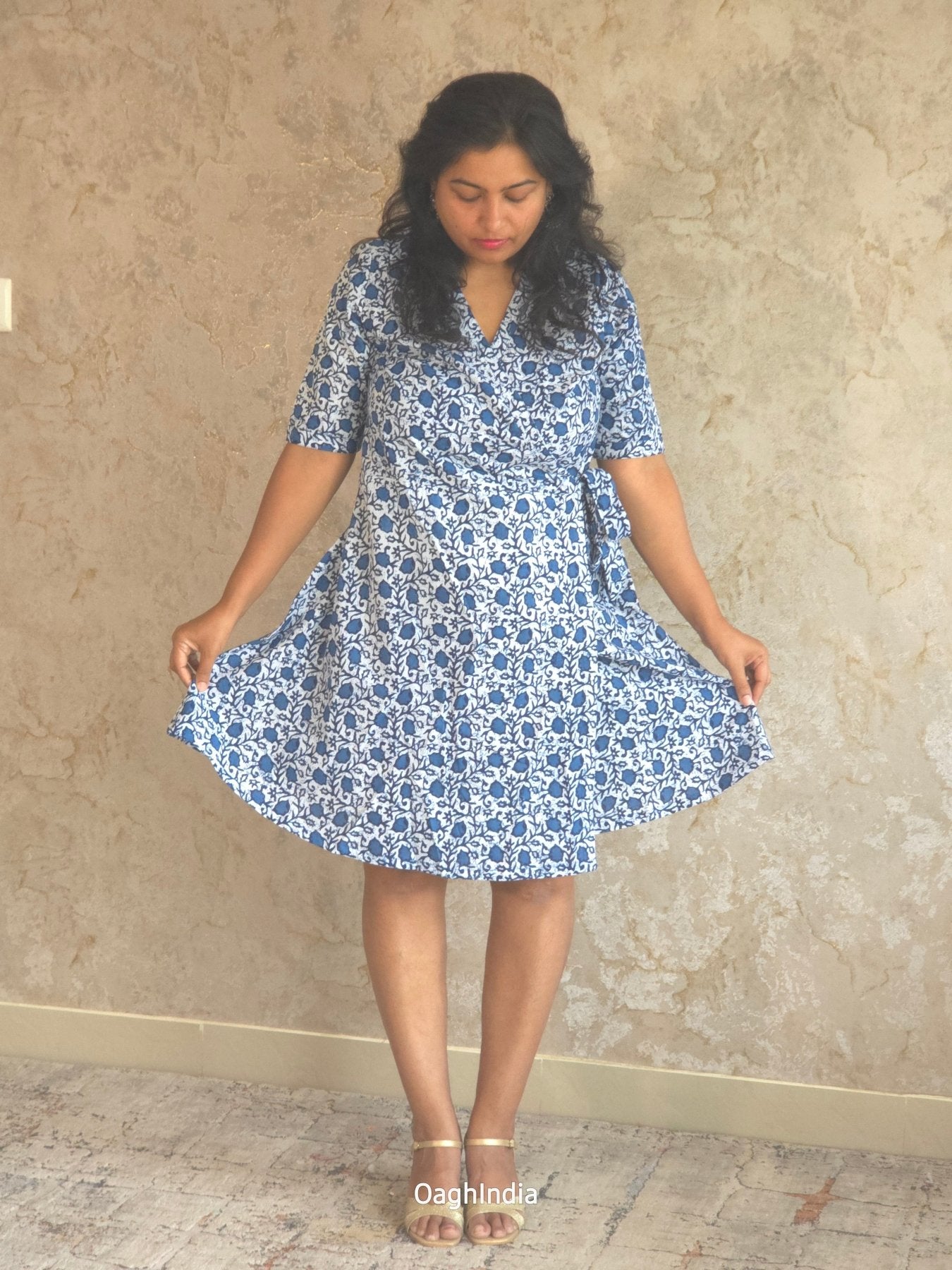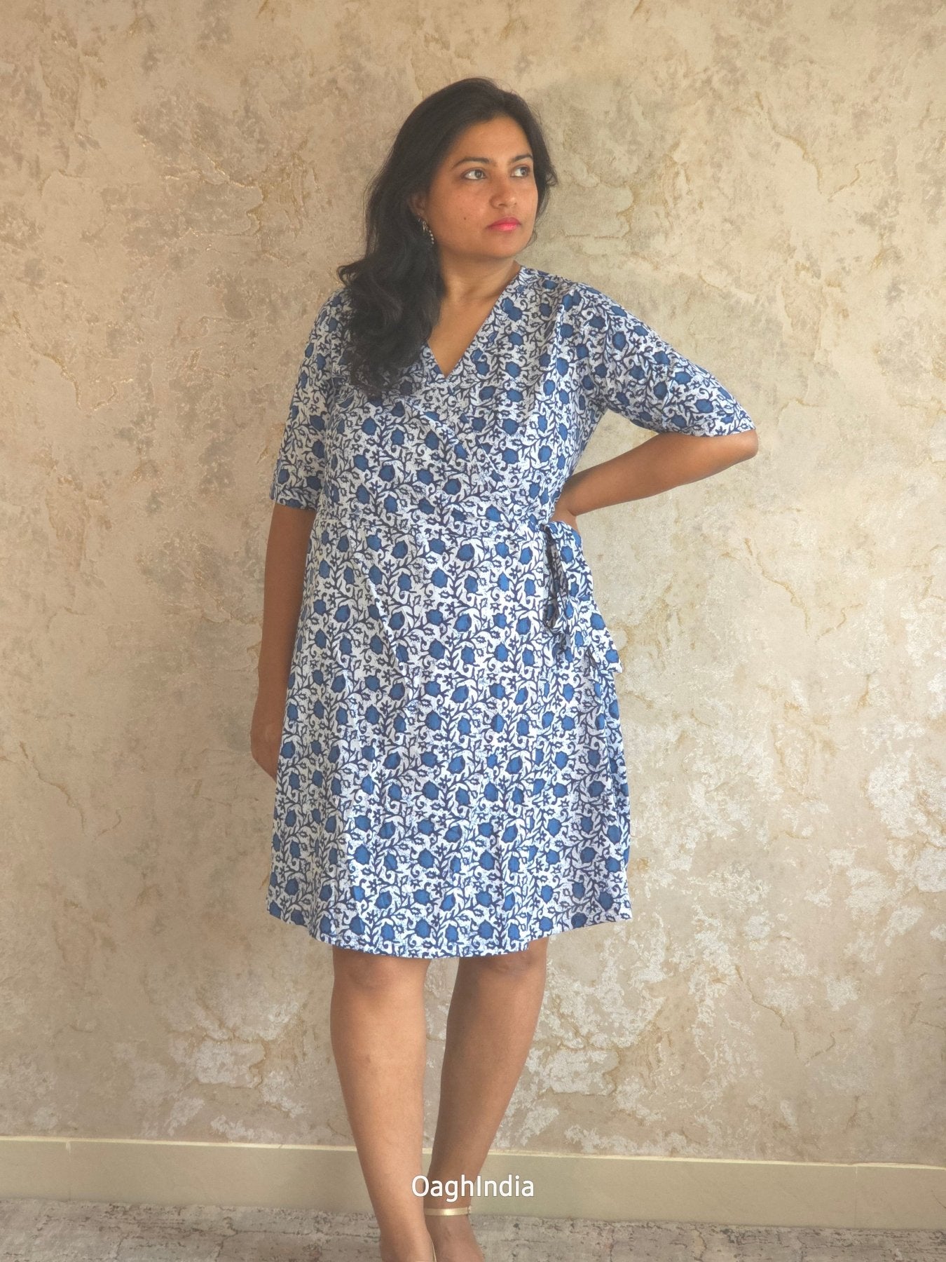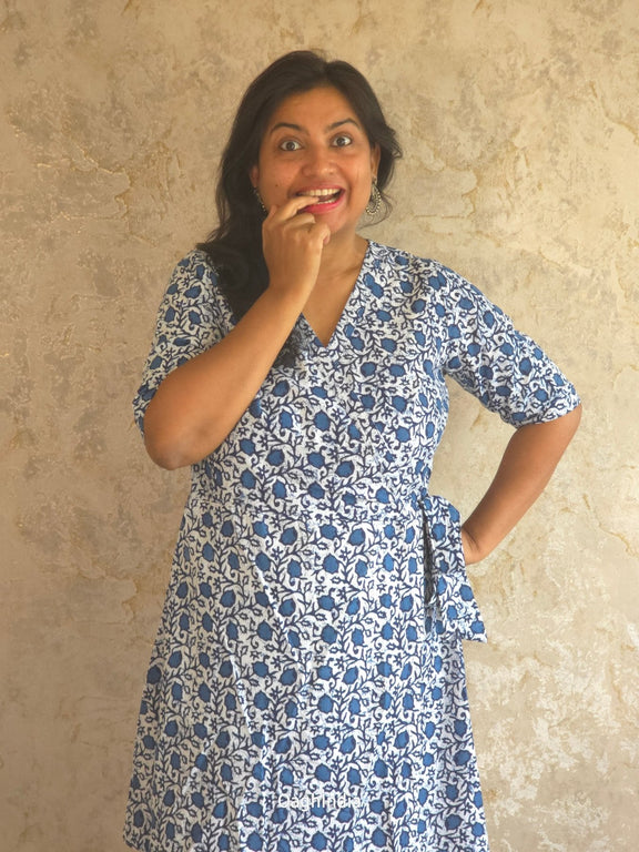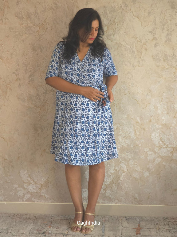 This stunning indigo and white wrap dress features a delicate flower and leaf pattern, creating a perfect blend of elegance and charm. Its wrap design offers a flattering fit for any body shape, while the soft, breathable fabric ensures comfort all day long. Ideal for casual outing, this dress effortlessly combines style and grace.