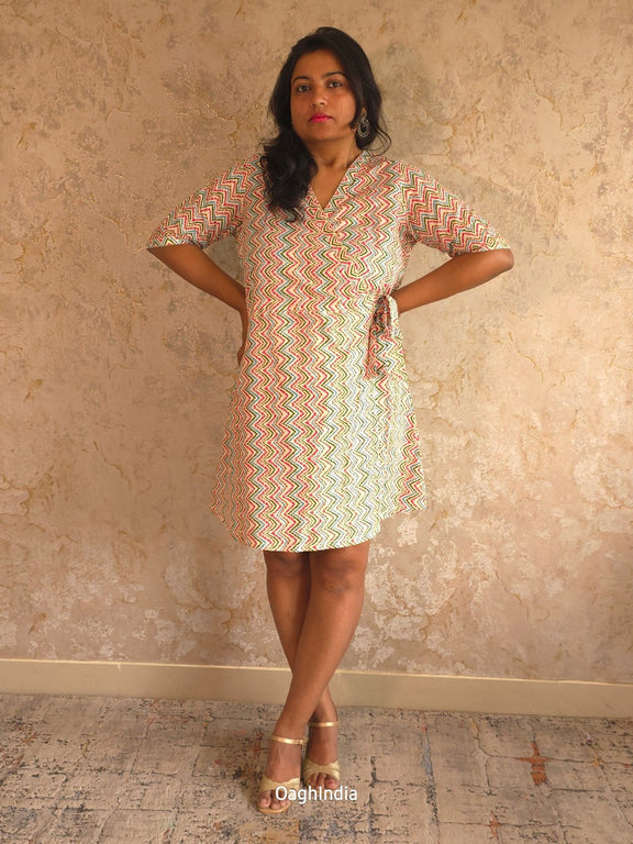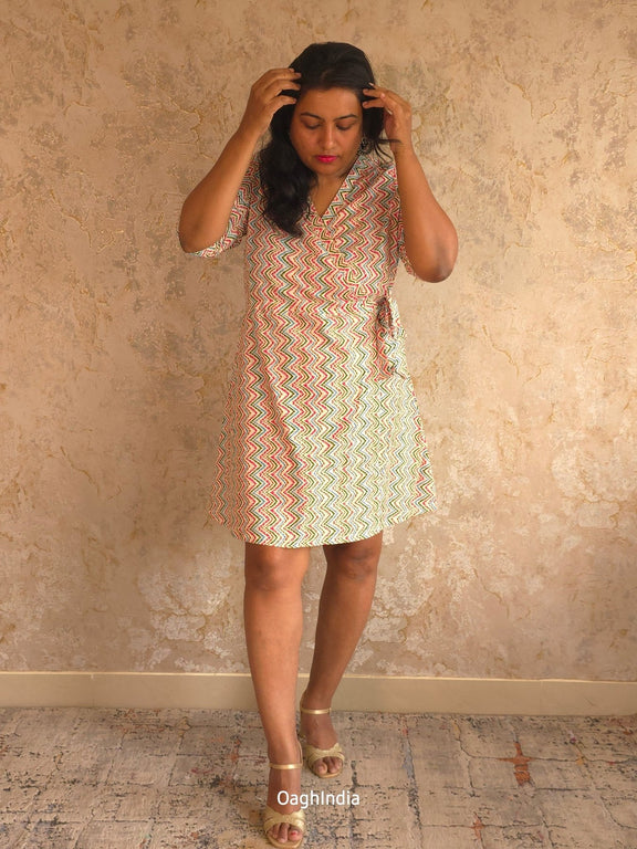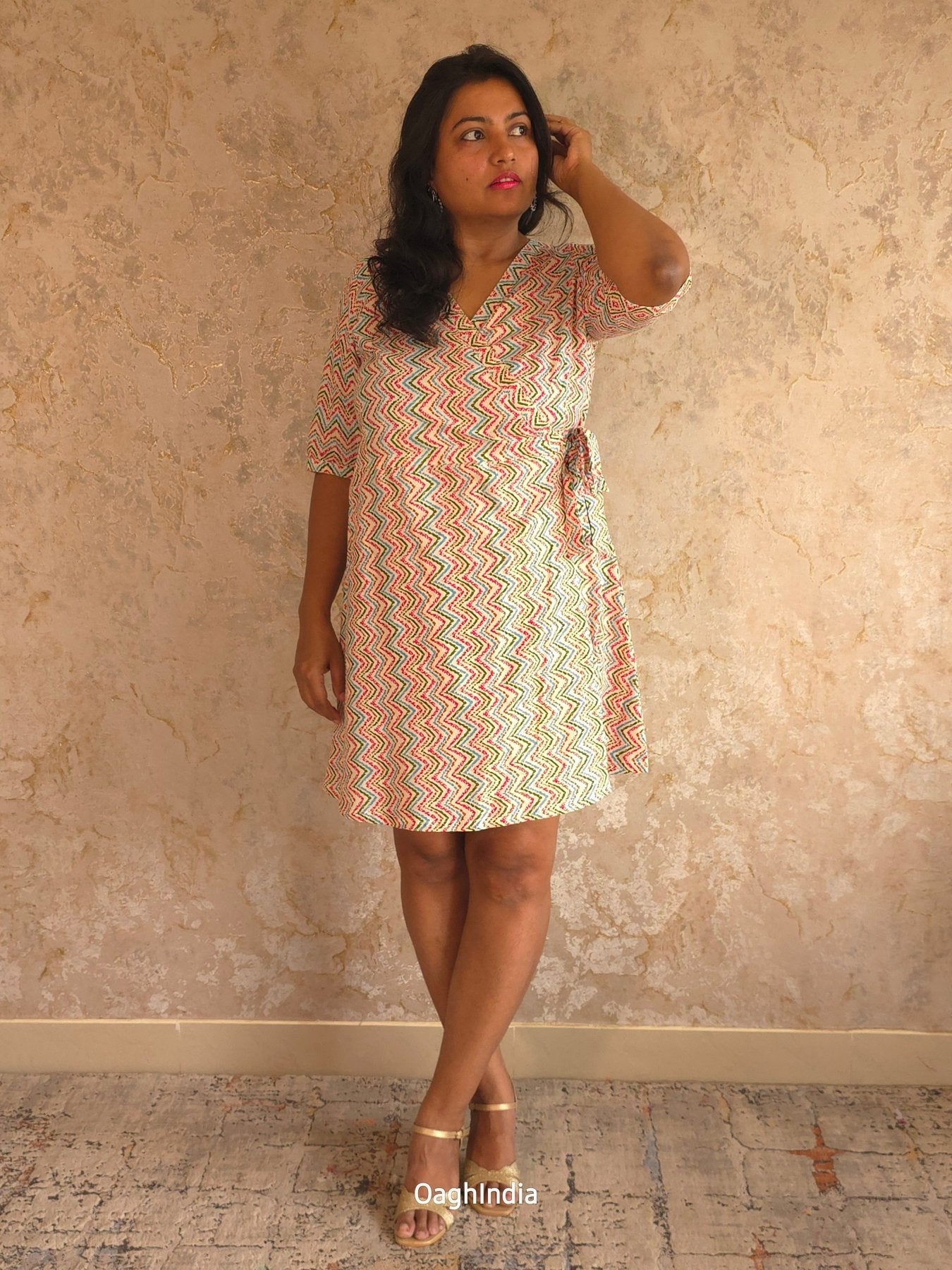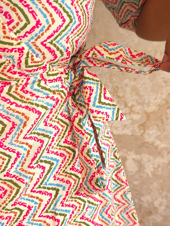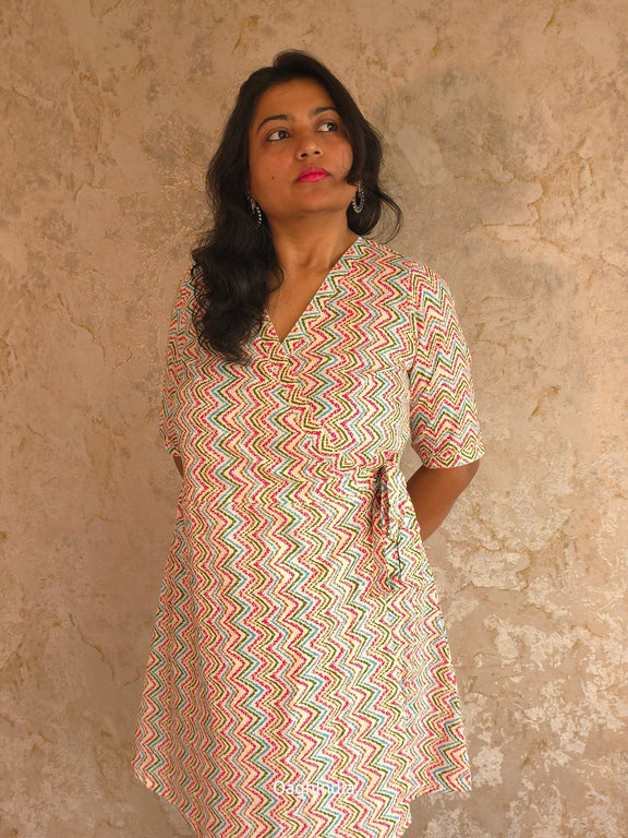 This multicolour wrap dress showcases the timeless beauty of lehariya patterns, with vibrant hues weaving a captivating tale of tradition and style. As the fabric gracefully wraps around you, it creates a lively, artistic look that’s perfect for both casual and festive occasions. Embrace the rich cultural charm and let your style shine effortlessly.