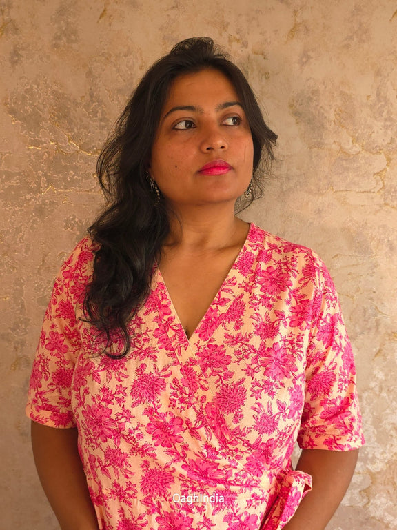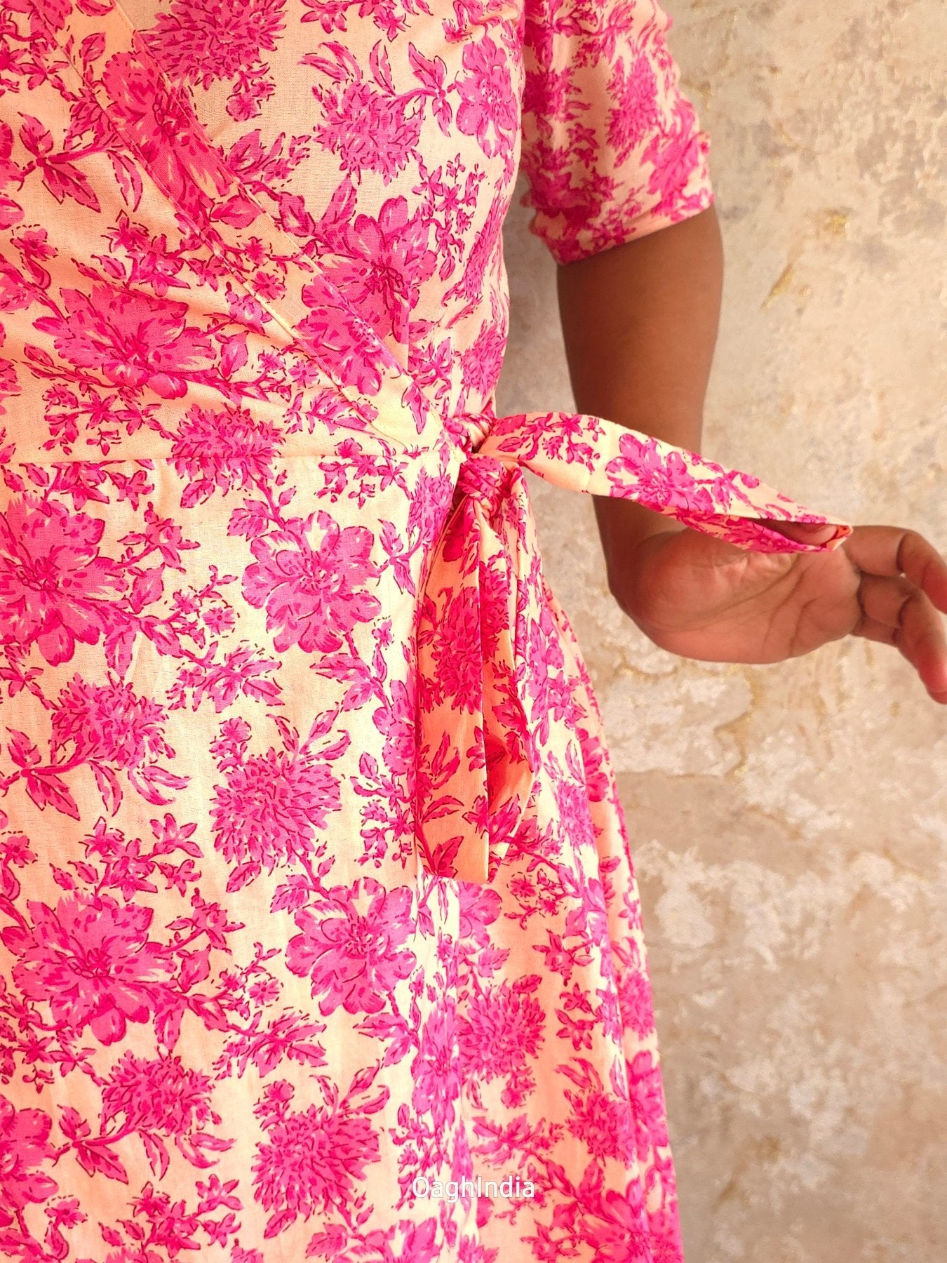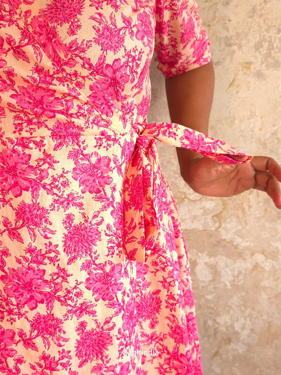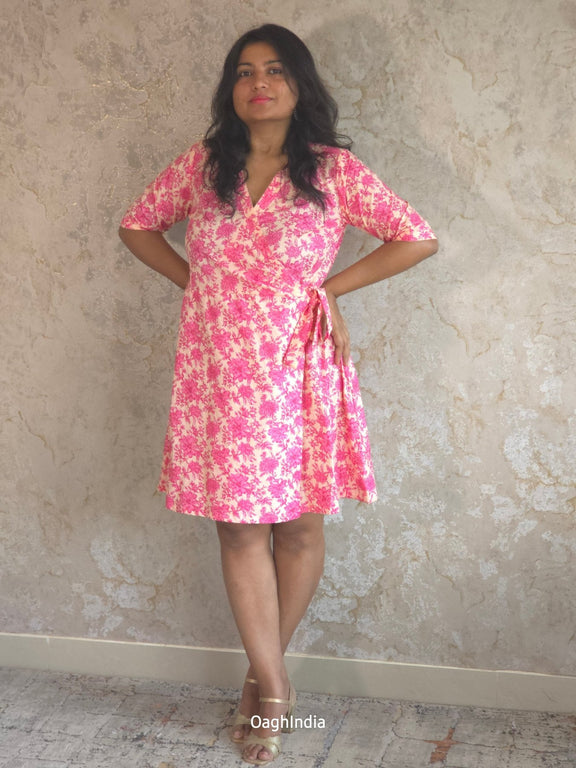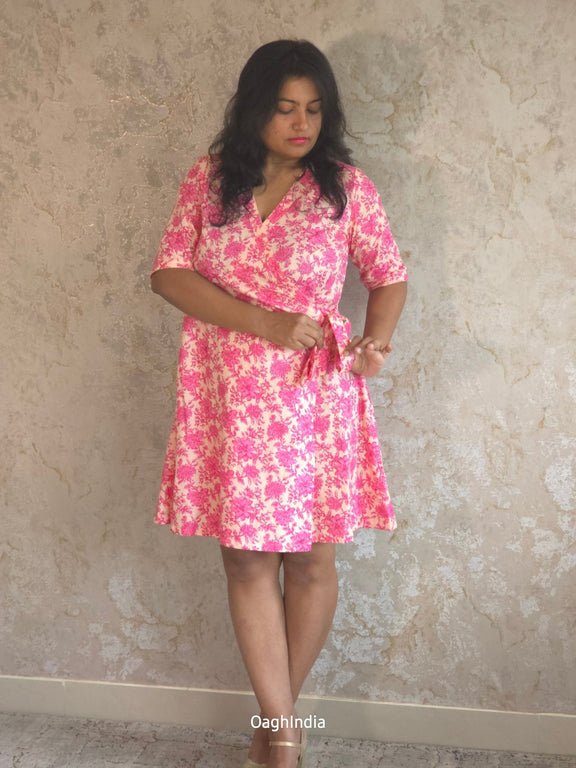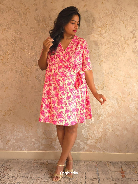 This wrap dress features a delightful white and pink flower pattern, blending elegance with a touch of whimsy. The soft fabric wraps around you beautifully, creating a flattering and comfortable fit. Perfect for both casual days and special occasions, this dress brings a fresh, floral charm to your wardrobe.